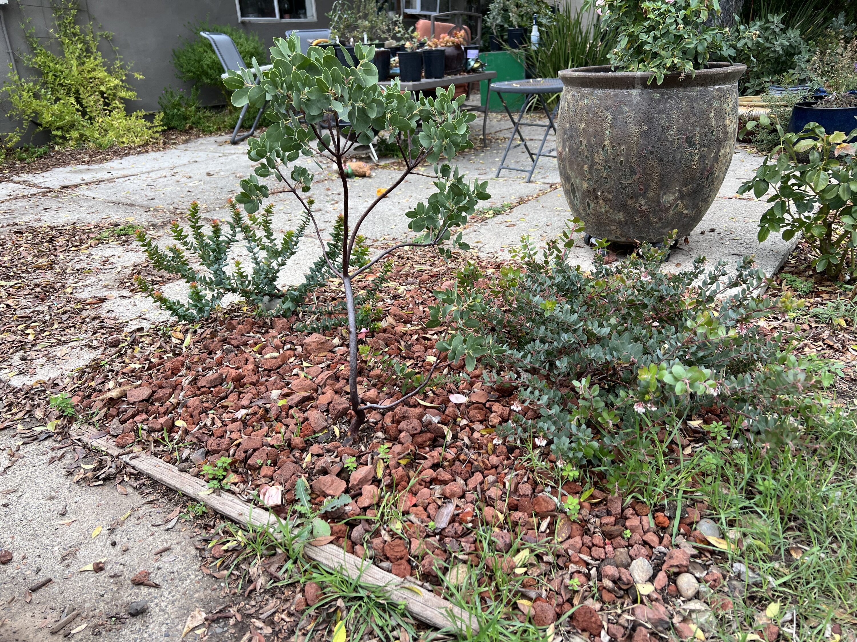It should pair nicely with the Byrd Hill Manzanita that will get to be 12′ tall or so. Brother James manzanita is on the far side, it should get to be about 4′ tall and maybe 6′ wide.