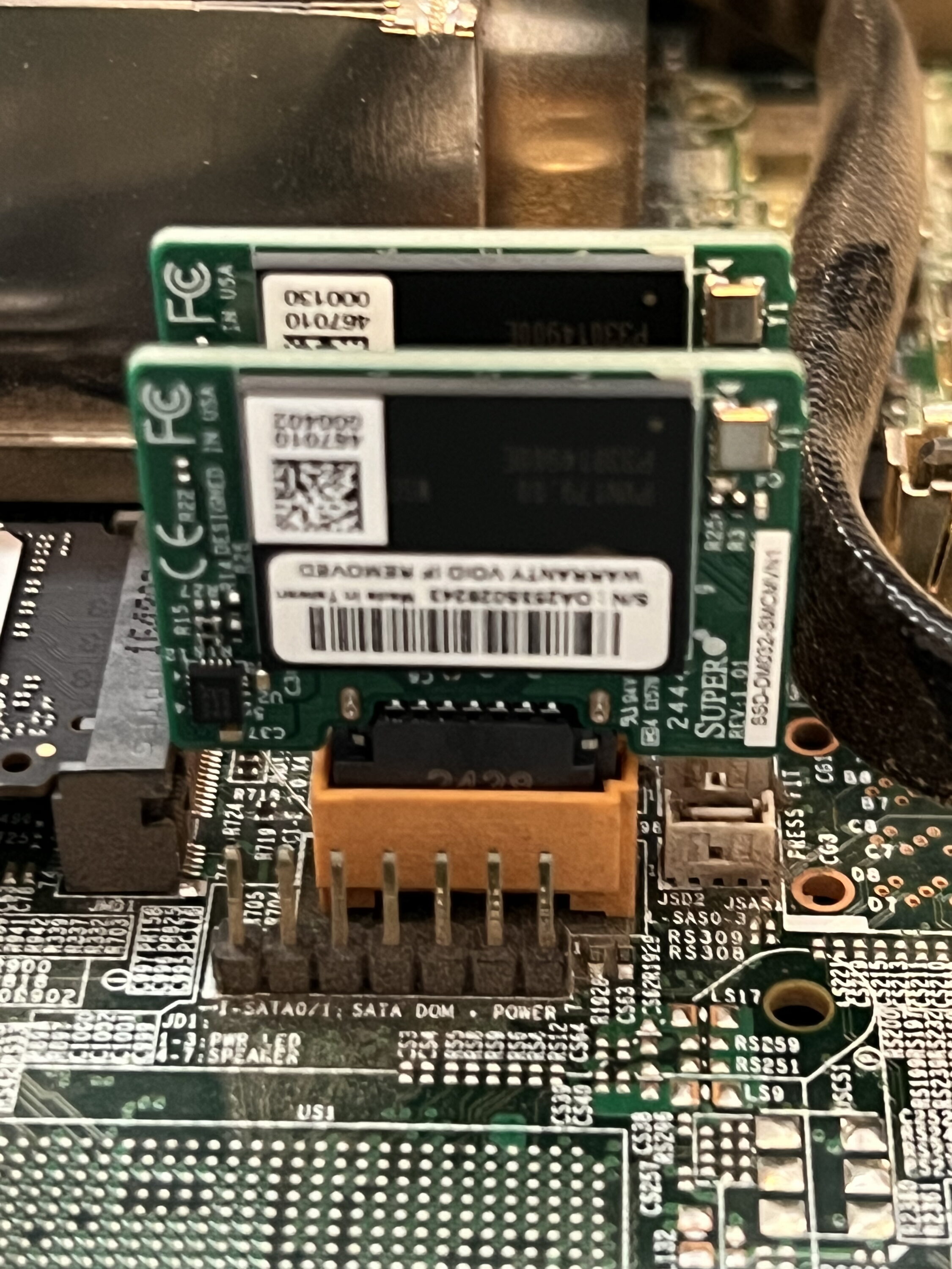 ESXi is running on these (2) Supermicro 32GB SATADOM’s configured in RAID 1. These drives get power directly from the board, so no need for power cables.