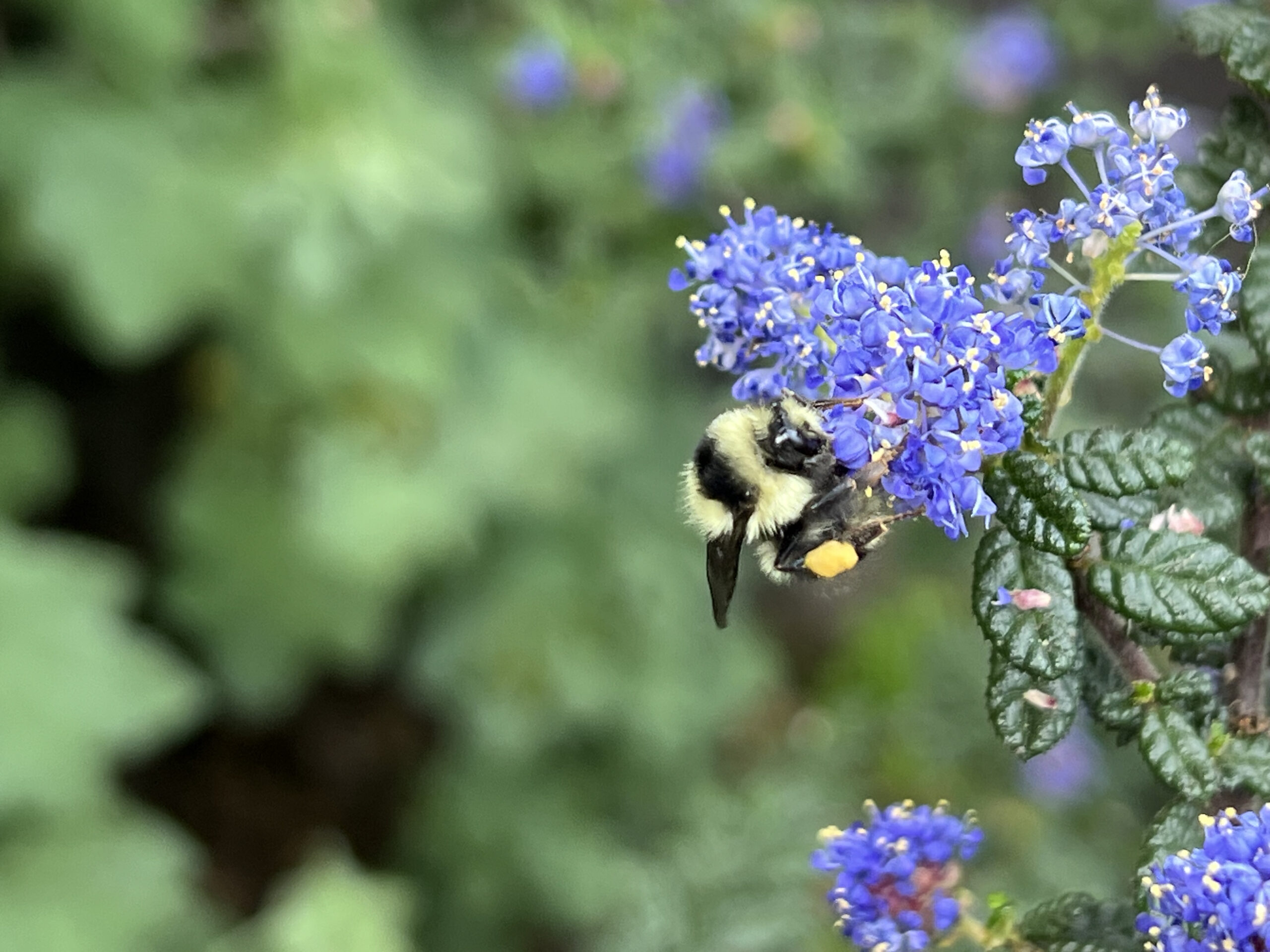 2/8/25 – Honey Bee working the Dark Star Ceanothus. He’s got a big sack of pollen on his legs as he works the flowers