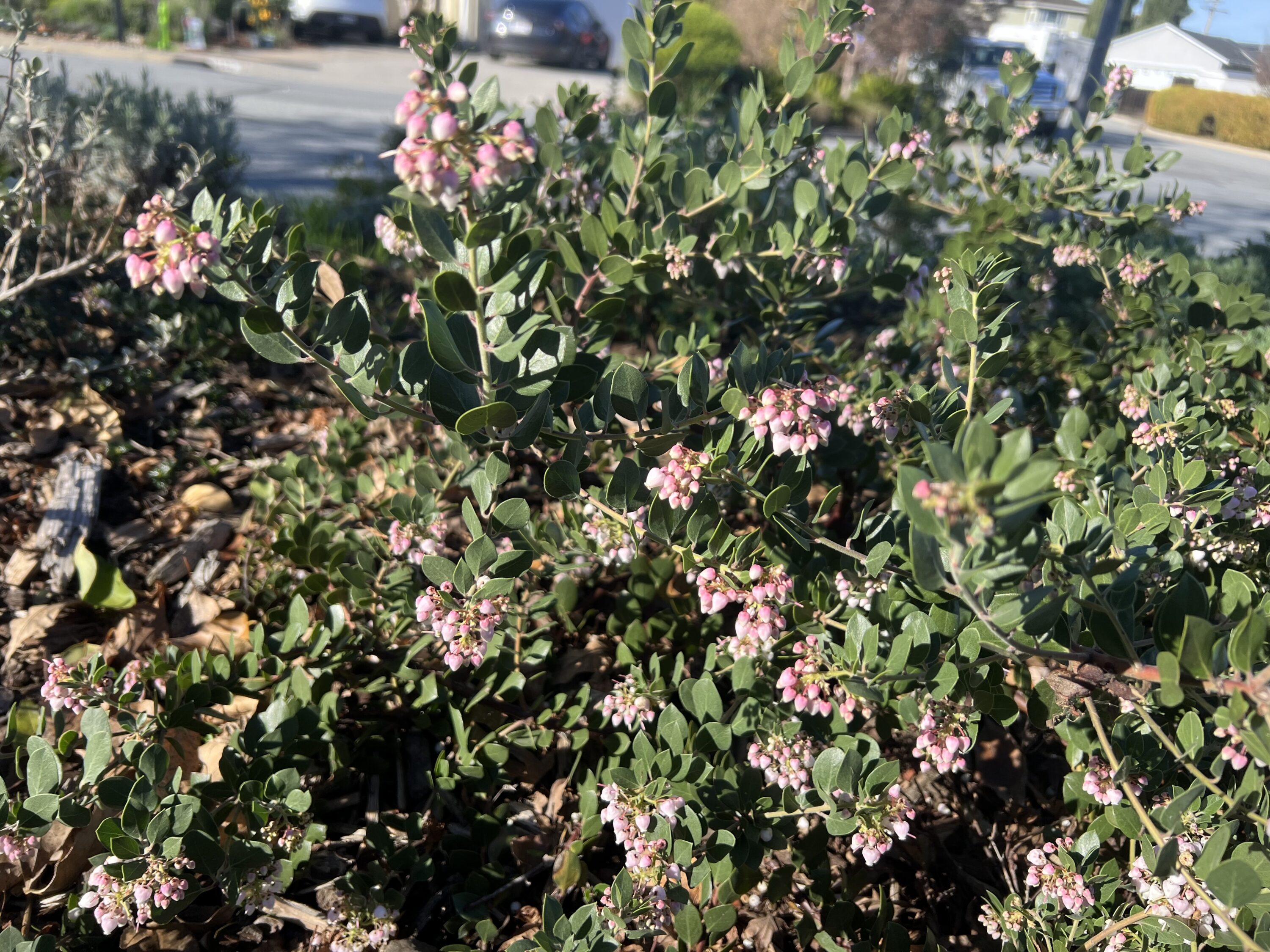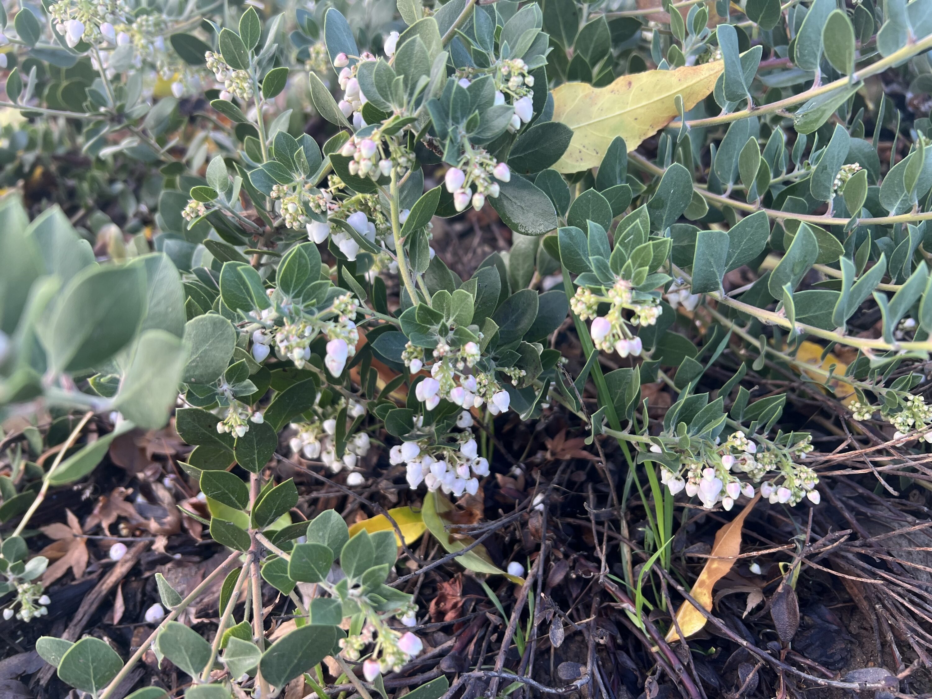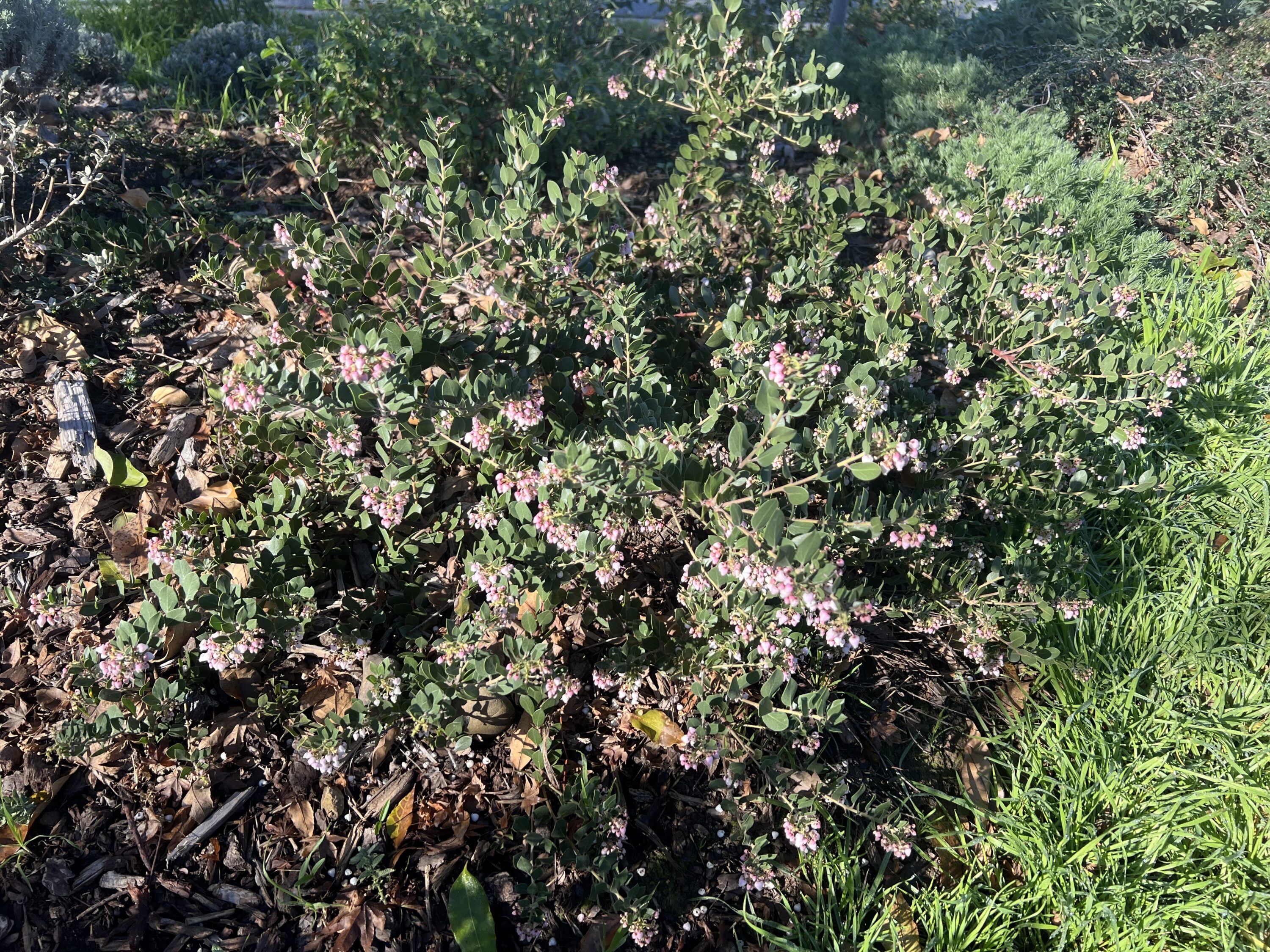12/26/25 – Big Sur manzanita is in peak flower; This is the most flowers it’s had since planting. Seems to be really enjoying this spot.