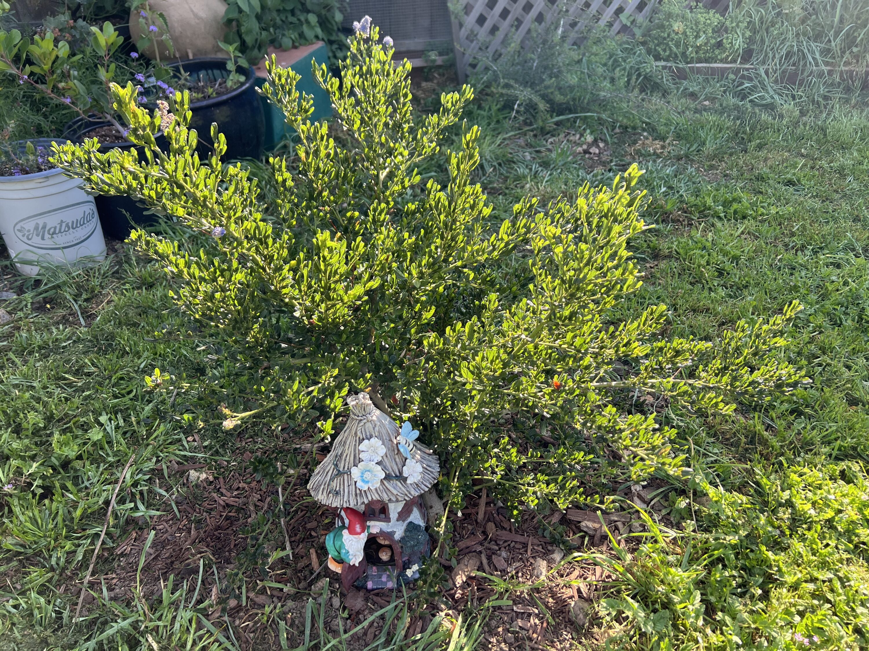 11/23/25 – It’s only been in the ground for 11 months. It’s such a dark green and seems very happy where it’s at. You can get an idea of how large it’s grown from the gnome house below it. If you look back to the first picture from when it was planted you can see it was just a small awkward looking stick.